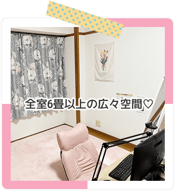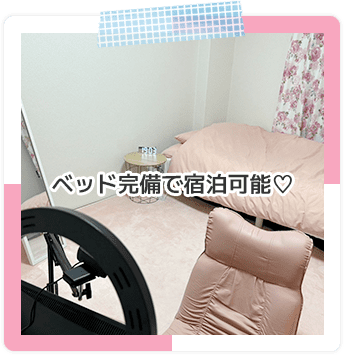 リリアンのチャットルームはインテリアやグッズ等、女性店長がこだわった可愛いお部屋です。全室6畳ほどの十分なゆとりがある広さなのでストレスなくお仕事していただけます。寝具やアメニティも揃えておりますので、お仕事しながらお泊りでもお気軽にご利用いただけます。
